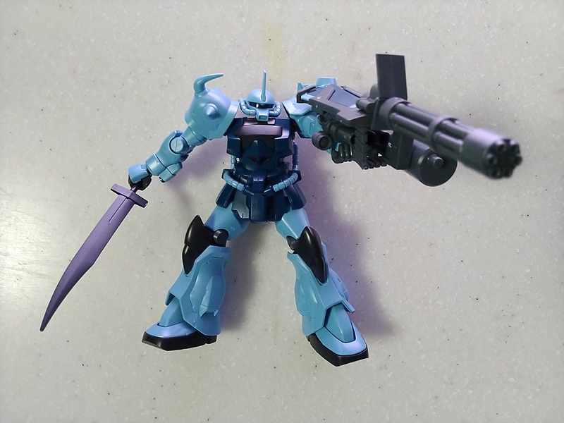 グフR35をベースにした改造機を作る中で、一部のパーツをこちらから引っ張ってきた方がいいのかな?と考えてとりあえず組んでみたグフカスタムです。(シールはモノアイを含めて一切貼っていません。といってもモノアイと、3連装35mmガトリング砲のセンサーの2カ所だけですが)