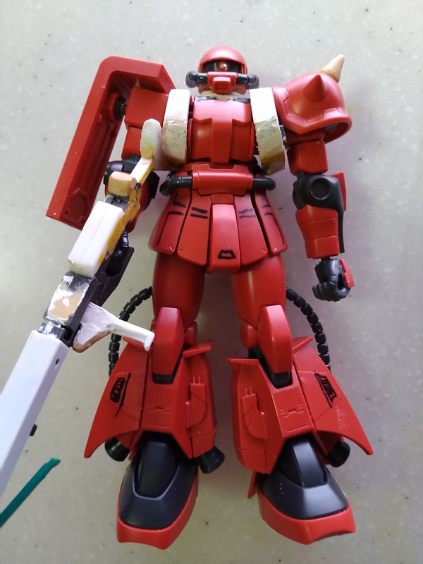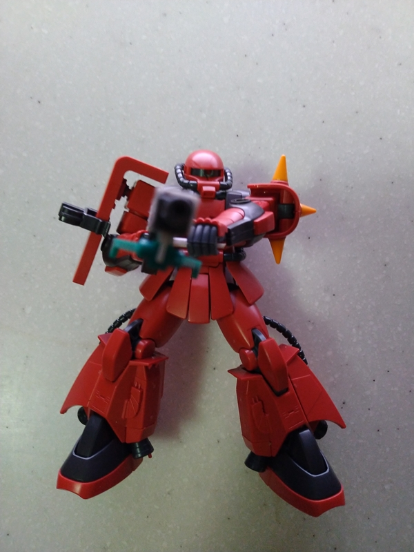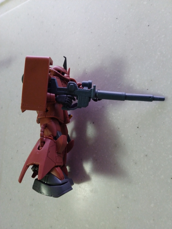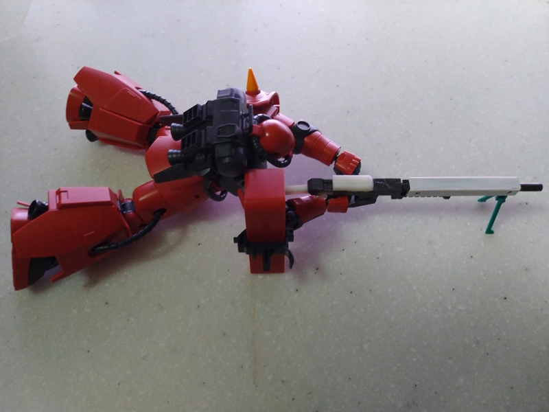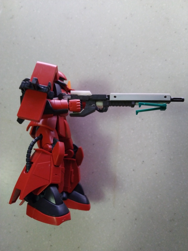 なお、この機体の設定ですが、元々はキマイラ隊で高機動型ザクにビームライフルを装備させるテスト機だったのは設定どおりですが、キマイラ隊がゲルググに使用機体を切り替えていった際に、ビーム兵器が使用可能な余剰機体としてサイド3本国の防衛部隊(実際には本人が搭乗して戦闘することが無かったとされているシン・マツナガ専用のゲルググJと同じ部隊)に配属された、という想定で最終的な塗装やマーキングをすることになりそうです。