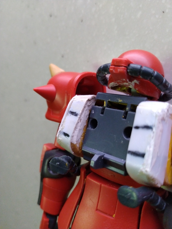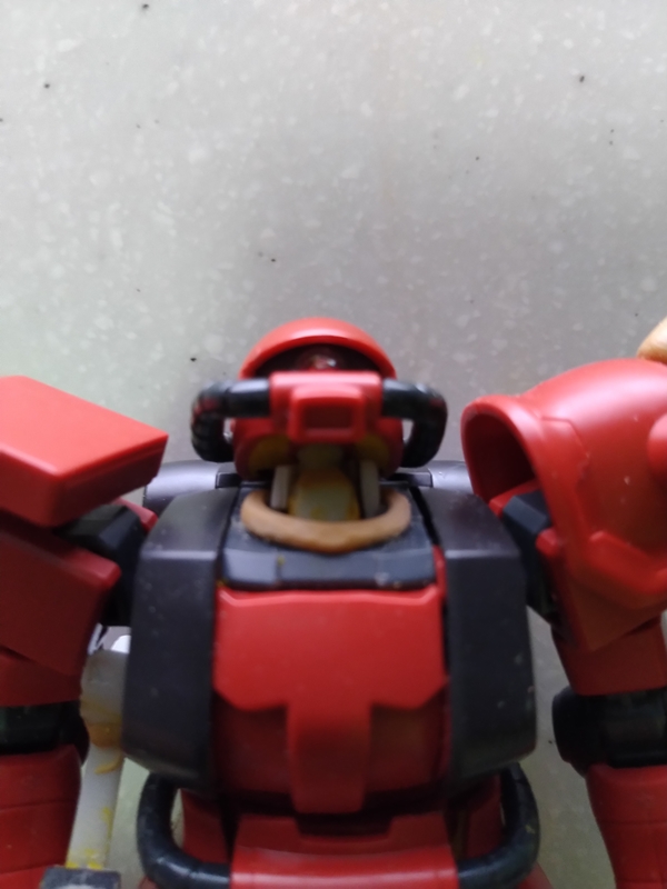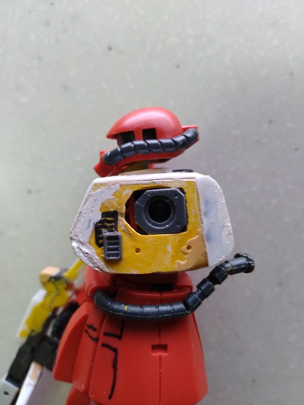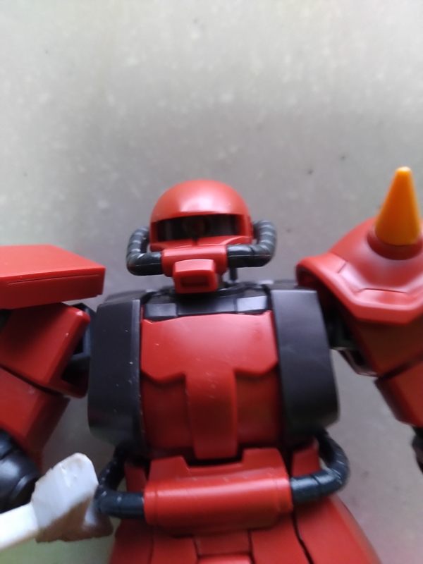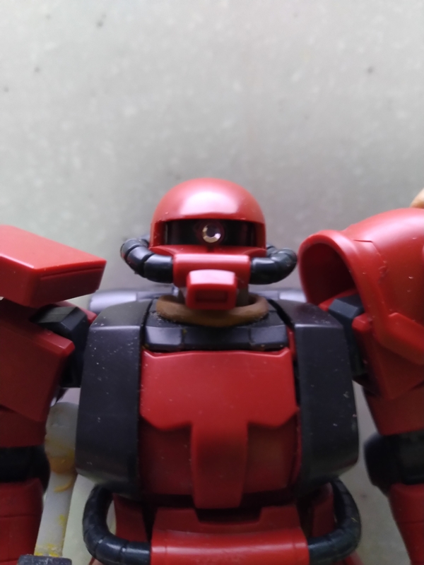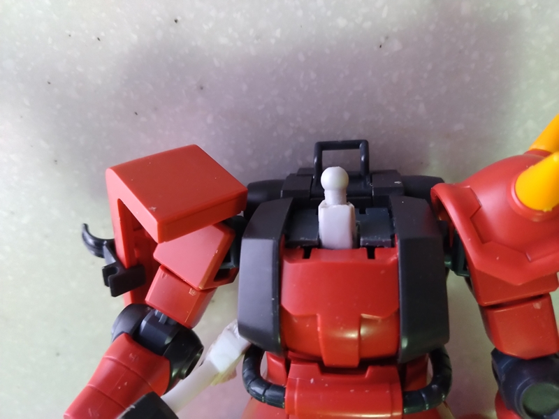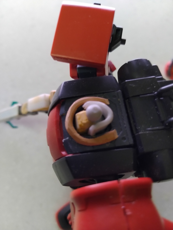 以前から、首の動きをよくするための改修を進めていましたが、ベースとなる首関節パーツが、オリジナルのポリキャップよりも長めになっているということもあって、どうも頭部の位置が高すぎて、ザクっぽく無い感じになってしまっているのをなんとか頑張っているところです。
