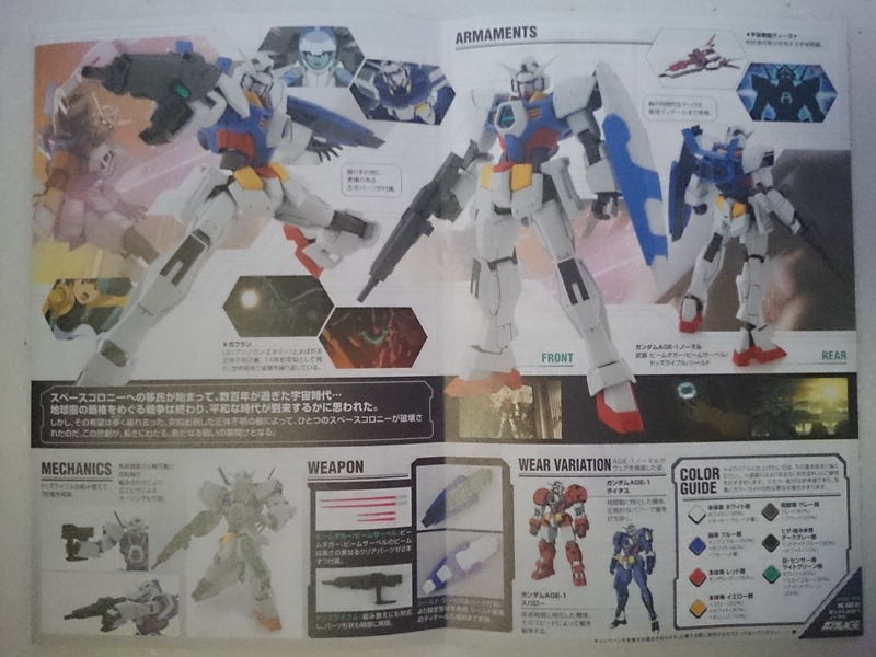 イメージ的にはAGEシリーズの主役機は、宇宙世紀ものの、ファースト>Z>ZZ>UCの各主役機をモデルにしているのかなと思ったりするので、今回のAGE-1は初代ガンダムっぽいデザインと配色。