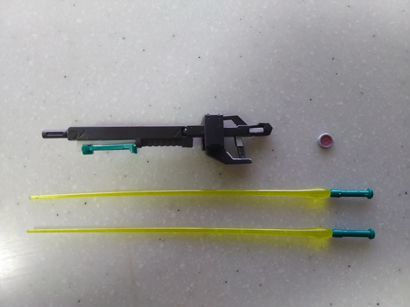 もともとこのパーツは黄色のビームサーベルが欲しいと思って買ったものですが、メガランチャー兼ビームライフルからも部品取りをして、バイポッドはここからパーツを拝借して、元キット同様に差し替えで立てた状態と収納状態を切り替え可能にする予定です。