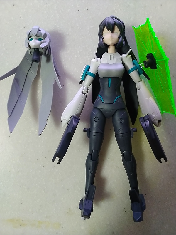 人型との差異は、成形色を除けば、フェイス部分と前髪が左右対称の各ばった物に変わっているだけですし、成形色に関してもランナーの関係で、余剰パーツで黒とグレーの両方で両形態を再現可能です。