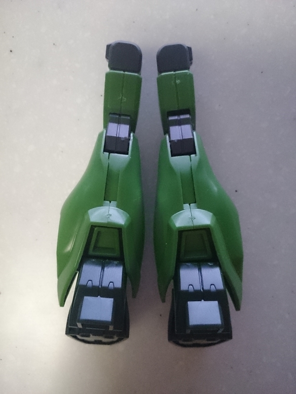 ポリキャップはPC123のキットのため、可動はできても後ハメなどの加工が難しい部分がありますし、色分けなども含めて最新のキットなら、ふくらはぎ側面のバーニアが別パーツになるとか、ふくらはぎ背部の濃いグレーの部分が色分けされているとか、変形のための可動部分に隙間ができないように工夫するとかは行われていたことでしょう。